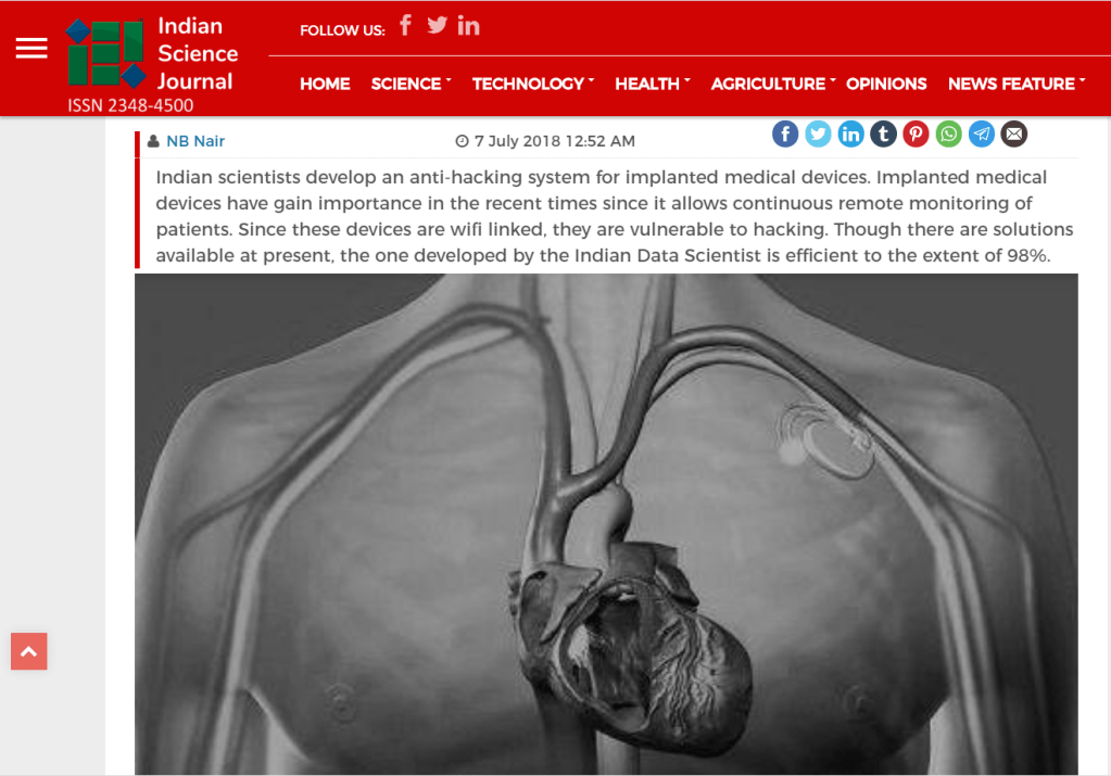 Indian Science Journal News! “Inspired by ancient wisdom, Indian scientist develops anti-hacking solution for implanted devices”
