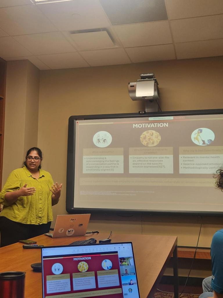 Roopika defended her MS Thesis (April 8, 2026) on “Enhancing Empathy in Conversational AI with Interpretable Lexicons and Reinforcement Learning from AI Feedback”. Her contributions include emotion-targeted lexicons and repetition aware empathetic response generation for emotionally grounded, and trustworthy empathetic systems.
